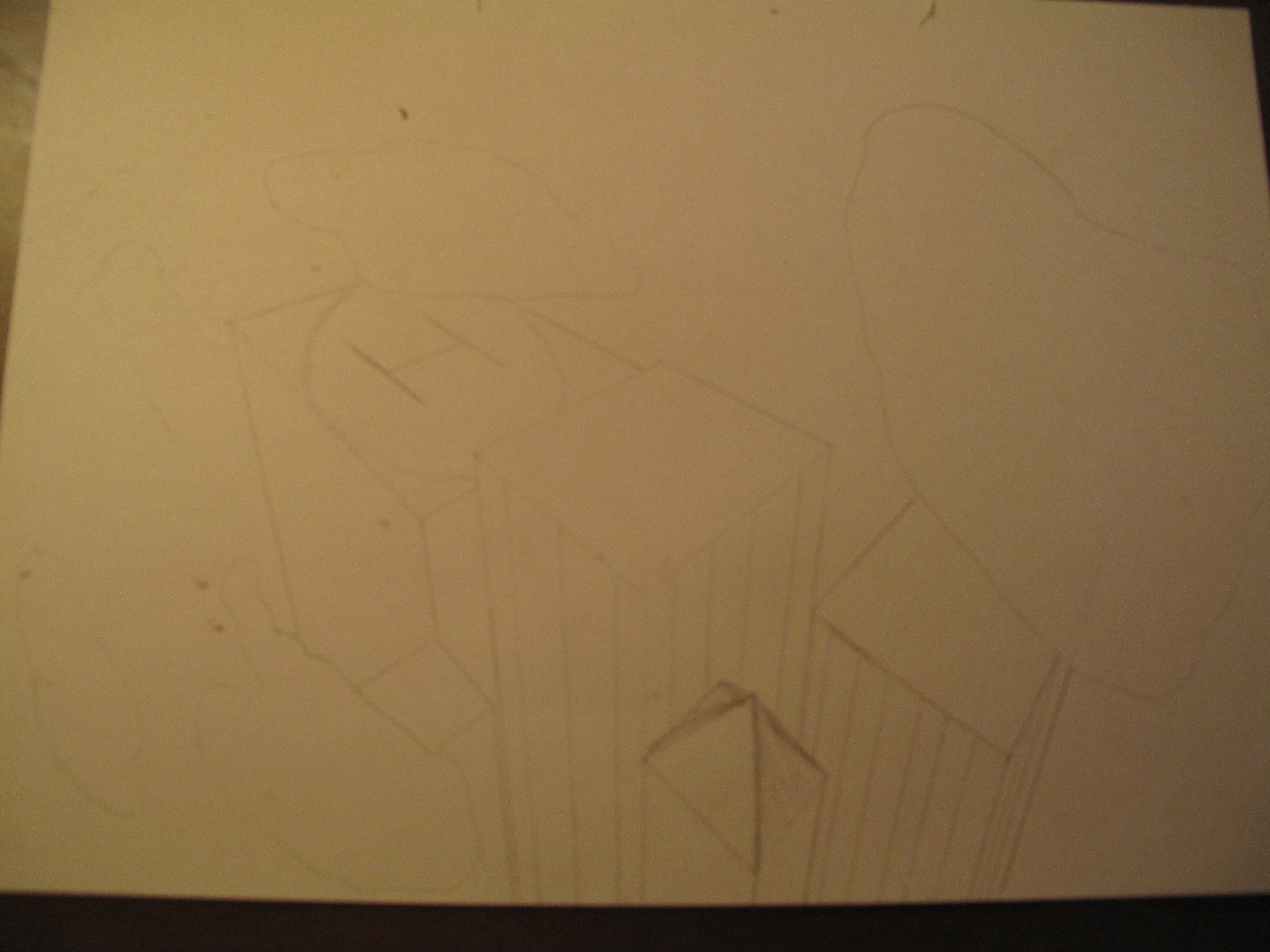I started out with some blocky shapes. The two perspectives diminishing into a horizon significantly higher than my previous effort. I found this aided in the believably of my buildings.